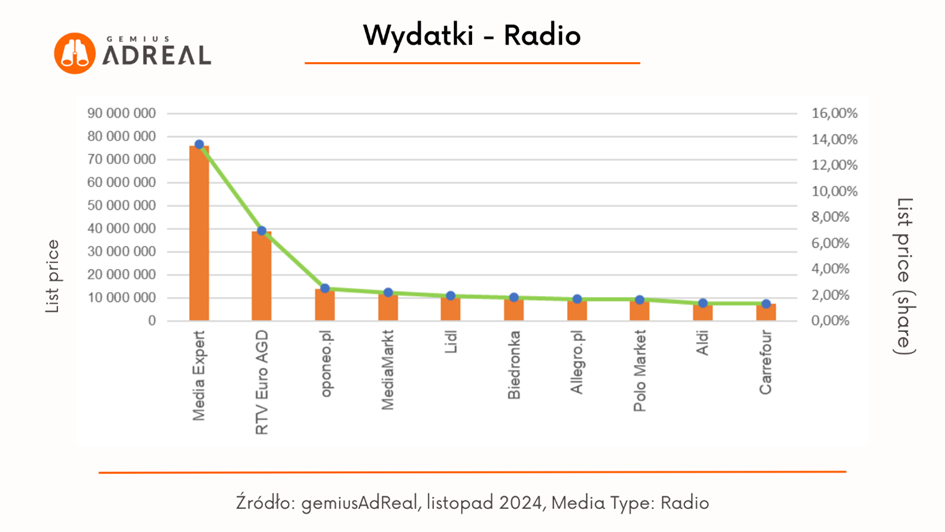 Najwyższy udział w wydatkach reklamowych w radiu miała w listopadzie marka Media Expert (13,48%). Kolejne miejsca należą do RTV Euro AGD (6,88%) oraz oponeo.pl (2,48%).