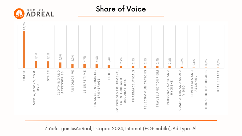 Najbardziej aktywna pod względem liczby kontaktów reklamowych online była branża „Trade” (39,9 mld), dla której Share of Voice we wszystkich kontaktach reklamowych online w listopadzie wyniósł 43,9%. Średni czas kontaktu dla tej branży wyniósł 9,60 sekundy, a wskaźnik widoczności kreacji – 47,89%.