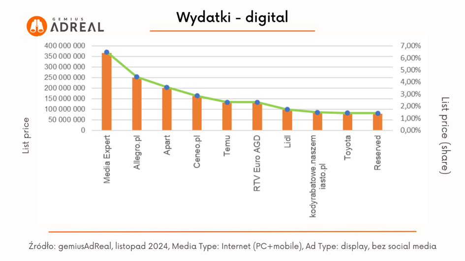 Najbardziej aktywnym reklamodawcą digital w listopadzie 2024 została marka Media Expert, która wygenerowała 4,66 mld kontaktów reklamowych online, docierając do 82,42% Polaków w wieku od 7 do 75 lat. Na drugim miejscu znalazł się Temu z 3,85 mld kontaktów i 81,18% zasięgu. Trzecie miejsce na podium należało do Allegro.pl (3,31 mld kontaktów i zasięg na poziomie 82,45%). Ranking TOP 10 marek zamyka ERLI, który odnotował 0,82 mld kontaktów reklamowych.