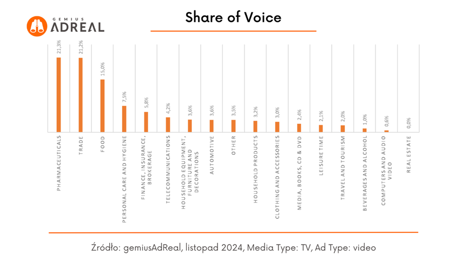 W listopadzie w telewizji najbardziej aktywna reklamowo była branża „Pharmaceuticals”. Wygenerowała ona 14,66 mld kontaktów reklamowych, docierając do 91,51% populacji w wieku od 7 do 75 lat. Share of Voice we wszystkich kontaktach reklamowych w listopadzie wyniósł dla tej branży 21,3%, natomiast średni czas kontaktu z reklamą w tradycyjnym odbiorniku – 19,45 sekundy. Na drugim miejscu znalazła się branża „Trade” (14,59 mld kontaktów reklamowych, SoV na poziomie 21,2% oraz 91,94% zasięgu), podium zamyka natomiast branża „Food” (10,32 mld kontaktów reklamowych, SoV – 15% i zasięg – 91,44%).