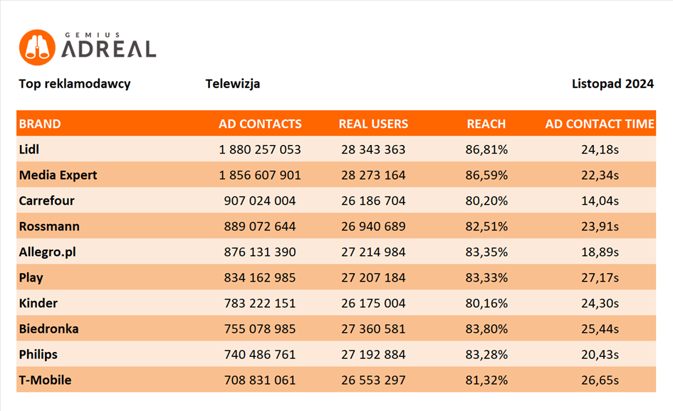 Najbardziej aktywnym reklamodawcą w telewizji w listopadzie była marka Lidl. Wygenerowała ona 1,88 mld kontaktów reklamowych, docierając do 86,81% Polaków w wieku od 7 do 75 lat. Na drugim miejscu znalazł się Media Expert (1,86 mld kontaktów reklamowych i 86,59% zasięgu), natomiast na trzecim – Carrefour (0,91 mld kontaktów i 80,20% zasięgu). Na 10. miejscu prezentowanego rankingu uplasowała się marka T-Mobile z 0,71 mld kontaktów reklamowych i 81,32% zasięgu w populacji 7-75.
