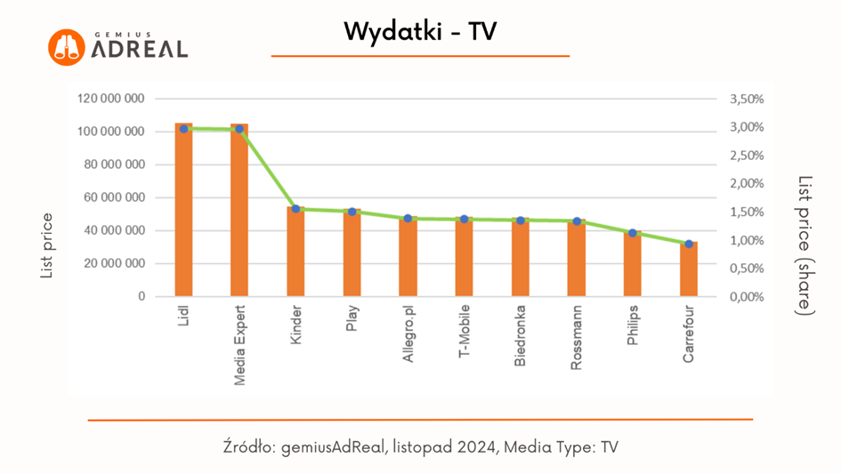 Pod względem estymowanych wydatków reklamowych w telewizji na pierwszym miejscu znalazła się marka Lidl – jej udział w wydatkach wyniósł 3,07% – a na drugim Media Expert, z udziałem na poziomie 3,06%. Trzecie miejsce należało do Kinder z udziałem 1,60%.