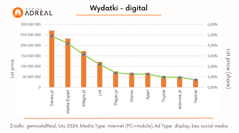 Najbardziej aktywnym reklamodawcą digital w lutym 2024 była marka Media Expert, która wygenerowała 2,81 mld kontaktów reklamowych online, docierając do 80,62% Polaków w wieku od 7 do 75 lat. Na drugim miejscu znalazło się Ceneo.pl z 2,63 mld kontaktów i 76,03% zasięgu. Trzecie miejsce na podium należało do Allegro (2,05 mld kontaktów i zasięg na poziomie 79,23%). Ranking TOP 10 marek zamyka marka Apart, która odnotowała 0,60 mld kontaktów reklamowych.