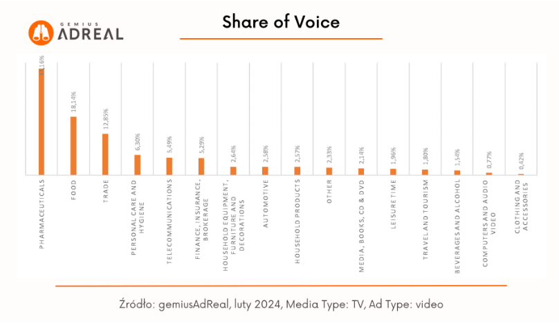 W lutym w telewizji najbardziej aktywna reklamowo była branża „Pharmaceuticals”. Wygenerowała ona ponad 21,3 mld kontaktów reklamowych, docierając do 91,56% populacji w wieku od 7 do 75 lat. Share of Voice we wszystkich kontaktach reklamowych w lutym wyniósł dla tej branży 33,16%, natomiast średni czas kontaktu z reklamą w tradycyjnym odbiorniku – 19,35 sekundy. Na drugim miejscu znalazła się branża „Food” (11,6 mld kontaktów reklamowych, SoV na poziomie 18,14% oraz 90,62% zasięgu), podium zamyka natomiast branża „Trade” (8,3 mld kontaktów reklamowych, SoV – 12,85% i zasięg – 90,46%).