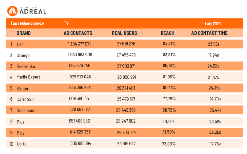 Najbardziej aktywnym reklamodawcą w telewizji w lutym była marka Lidl. Wygenerowała ona 1,3 mld kontaktów reklamowych, docierając do 84,31% Polaków w wieku od 7 do 75 lat. Na drugim miejscu znalazł się Orange (1,04 mld kontaktów reklamowych i 83,81% zasięgu), natomiast na trzecim – Biedronka (0,96 mld kontaktów i 85,18% zasięgu). Na 10. miejscu prezentowanego rankingu uplasowała się marka Lotto z 0,5 mld kontaktów reklamowych i 73% zasięgu w populacji 7-75.