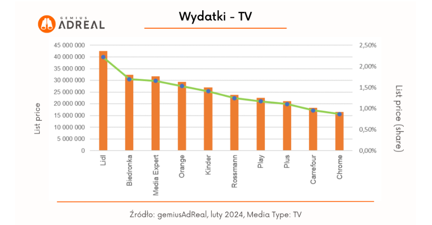 Pod względem estymowanych wydatków reklamowych w telewizji na pierwszym miejscu znalazła się marka Lidl – jej udział w wydatkach wyniósł 2,36% – a na drugim Biedronka, z udziałem na poziomie 1,80%. Trzecie miejsce należało do Media Expert z udziałem 1,76%.
