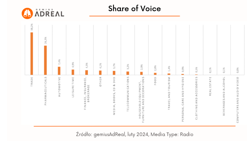 W radiu największą liczbę kontaktów reklamowych w lutym wygenerowała branża „Trade” (7,8 mld). Na drugim i trzecim miejscu znalazły się branże „Pharmaceuticals” (5,39 mld kontaktów) oraz „Automotive” (1,52 mld kontaktów reklamowych).