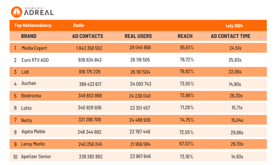 Najbardziej aktywnym reklamodawcą w radiu w lutym była ponownie marka Media Expert wygenerowała ona 1,84 mld kontaktów reklamowych, docierając do 85,61% Polaków w wieku od 7 do 75 lat. Na drugim miejscu znalazło się Euro RTV AGD (0,94 mld kontaktów reklamowych, 79,72% zasięgu), a na trzecim – Lidl (0,82 mld kontaktów, 79.92% zasięgu). Zestawienie TOP 10 zamyka marka Apetizer Senior (0,24 mld kontaktów i 73,16% zasięgu).