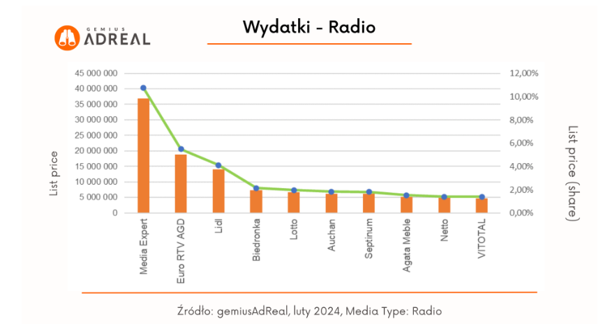 Najwyższy udział w wydatkach reklamowych w radiu miała w lutym marka Media Expert (9,83%). Kolejne miejsca należą do Euro RTV AGD (5,02%) oraz Lidla (3,75%).