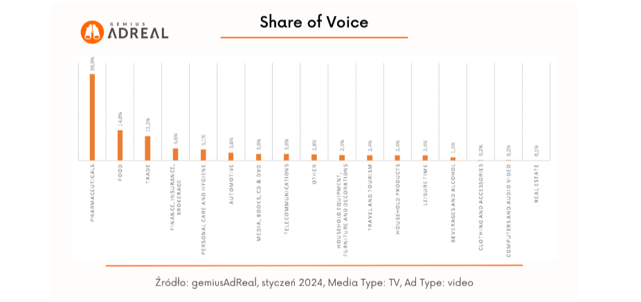 W styczniu w telewizji najbardziej aktywna reklamowo była branża „Pharmaceuticals”. Wygenerowała ona ponad 27,9 mld kontaktów reklamowych, docierając do 92,37% populacji w wieku od 7 do 75 lat.