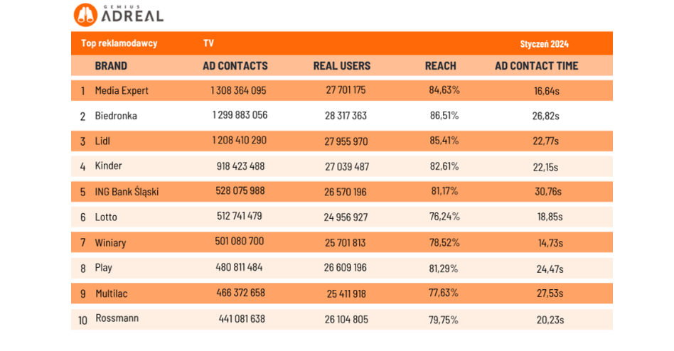 Najbardziej aktywnym reklamodawcą w telewizji w styczniu była marka Media Expert. Wygenerowała ona 1,3 mld kontaktów reklamowych, docierając do 84,63% Polaków w wieku od 7 do 75 lat.