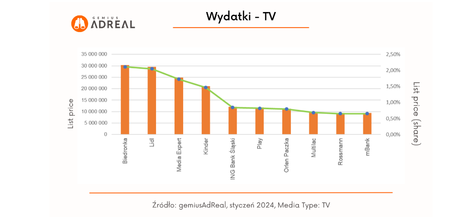 Pod względem estymowanych wydatków reklamowych w telewizji na pierwszym miejscu znalazła się marka Biedronka – jej udział w wydatkach wyniósł 2,17% – a na drugim Lidl, z udziałem na poziomie 2,11%. Trzecie miejsce należało do Media Expert z udziałem 1,77%.