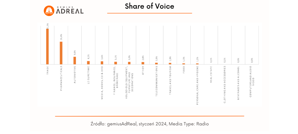 W radiu branżą o największej liczbie kontaktów reklamowych w styczniu była branża „Trade” (7,7 mld). Na drugim i trzecim miejscu znalazły się branże „Pharmaceuticals” (4,89 mld kontaktów) oraz „Automotive” (1,67 mld kontaktów reklamowych).