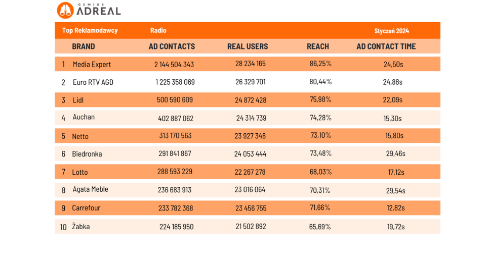 Najbardziej aktywnym reklamodawcą w radiu w styczniu była ponownie marka Media Expert – wygenerowała ona 2,14 mld kontaktów reklamowych, docierając do 86,25% Polaków w wieku od 7 do 75 lat.