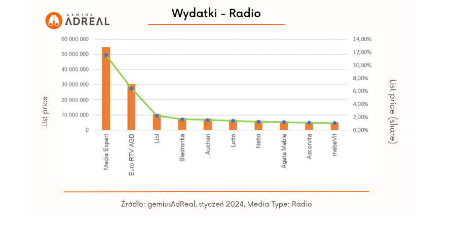 Najwyższy udział w wydatkach reklamowych w radiu miała w styczniu marka Media Expert (12,77%). Kolejne miejsca należą do Euro RTV AGD (7,08%) oraz Lidl (2,48%).
