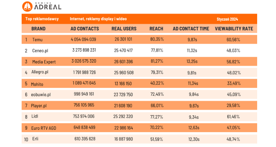 Najbardziej aktywnym reklamodawcą digital w styczniu 2024 po raz pierwszy została marka Temu, która wygenerowała 4,05 mld kontaktów reklamowych online, docierając do 80,35% Polaków w wieku od 7 do 75 lat. Na drugim miejscu znalazło się Ceneo.pl z 3,3 mld kontaktów i 77,81% zasięgu. Trzecie miejsce na podium należało do MediaExpert (3 mld kontaktów i zasięg na poziomie 81,27%).