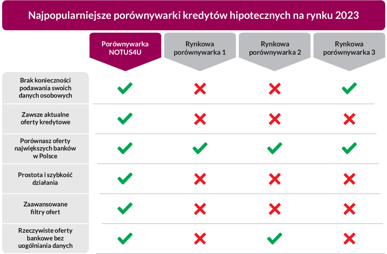 Nowa porównywarka NOTUS4U to unikalne narzędzie, które umożliwia klientom uzyskanie pełnej wiedzy o produktach finansowych bez konieczności podawania swoich danych osobowych. W przeciwieństwie do innych firm, które skupiają się na pozyskaniu danych potencjalnych klientów, NOTUS4U stawia na pierwszym miejscu klienta i jego potrzeby i decyzje. Narzędzie to korzysta z aktualnych danych, które są w czasie rzeczywistym analizowane i porównywane z ofertami wszystkich banków na polskim rynku. NOTUS4U pracuje w oparciu o kooperacje z bazą danych i innymi narzędziami spółki NOTUS Finanse, które od lat, każdego dnia agregują tysiące mniejszych lub większych zmiennych dotyczących ofert oraz zachowań i reakcji konsumenckich.