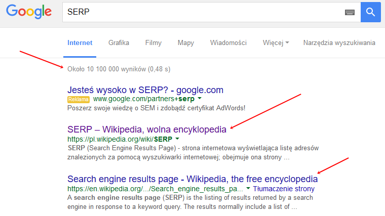 Potocznie mówiąc SERPy, mamy na myśli kilka pierwszych stron wyników wyszukiwania. Mówiąc top10, potocznie mamy na myśli pierwszą stronę bezpłatnych wyników wyszukiwania.