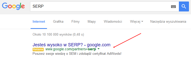 [Bartłomiej Speth:] SERP (ang. Search Engine Results Page) to dosłownie strona z wynikami wyszukiwania. Pojawia się w momencie gdy zapytamy wyszukiwarkę o konkretne słowo czy wyrażenie.