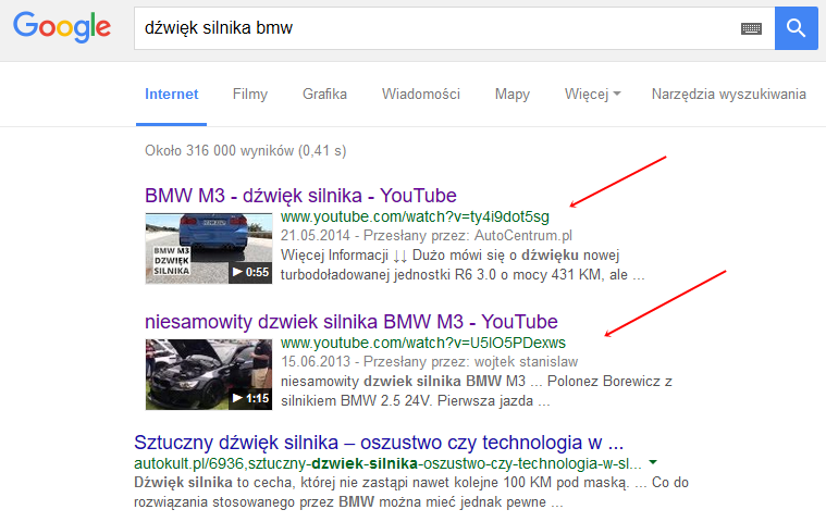 Inne zapytanie, poza standardowymi stronami, wyświetli nam również film:
