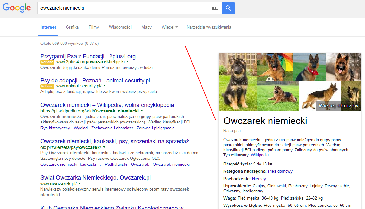 Pewne zapytania mogą wyświetlić wyniki dodatkowo rozszerzone o tzw. graf wiedzy (ang. Knowledge Graph). Jest to skrót najważniejszych informacji z danej tematyki przedstawiany od razu na stronie wyników wyszukiwania: