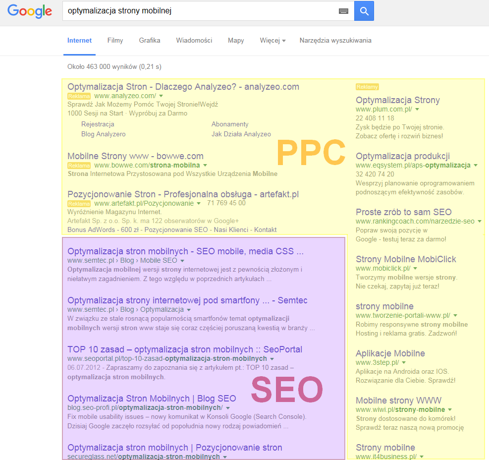 Dla zapytań, gdzie liczba wyników jest większa, a tym samym konkurencyjność teoretycznie również jest większa, Google może dodatkowo wyświetlić płatne reklamy: