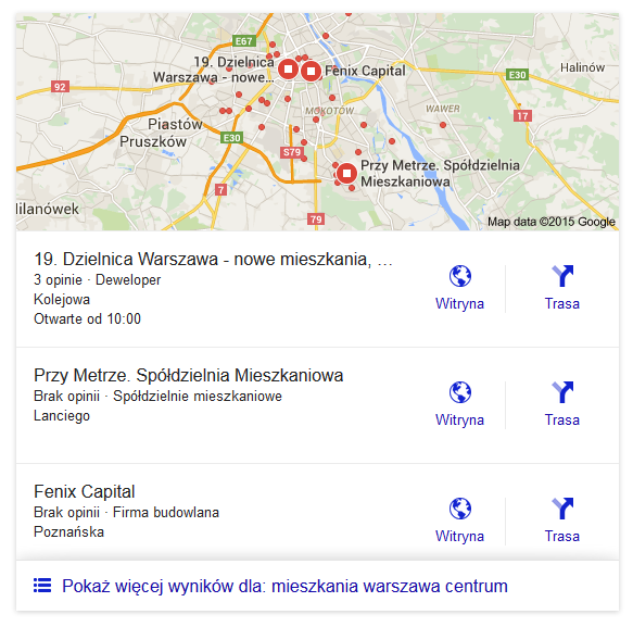Przykład wyników Google dla frazy lokalizacyjnej „mieszkania warszawa centrum”