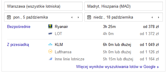 Wynik wyszukiwania w Google lotów z Warszawy do Madrytu