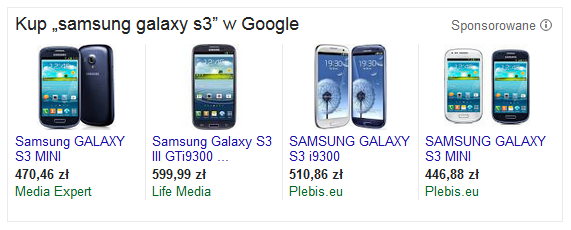 Z kolei w płatnych rezultatach Google oprócz tradycyjnych tekstowych reklam AdWords prezentowane są także dla niektórych zapytań reklamy graficzne Google Shopping (Zakupy Google), nazywane także PLA (ang. Product Listing Ads).