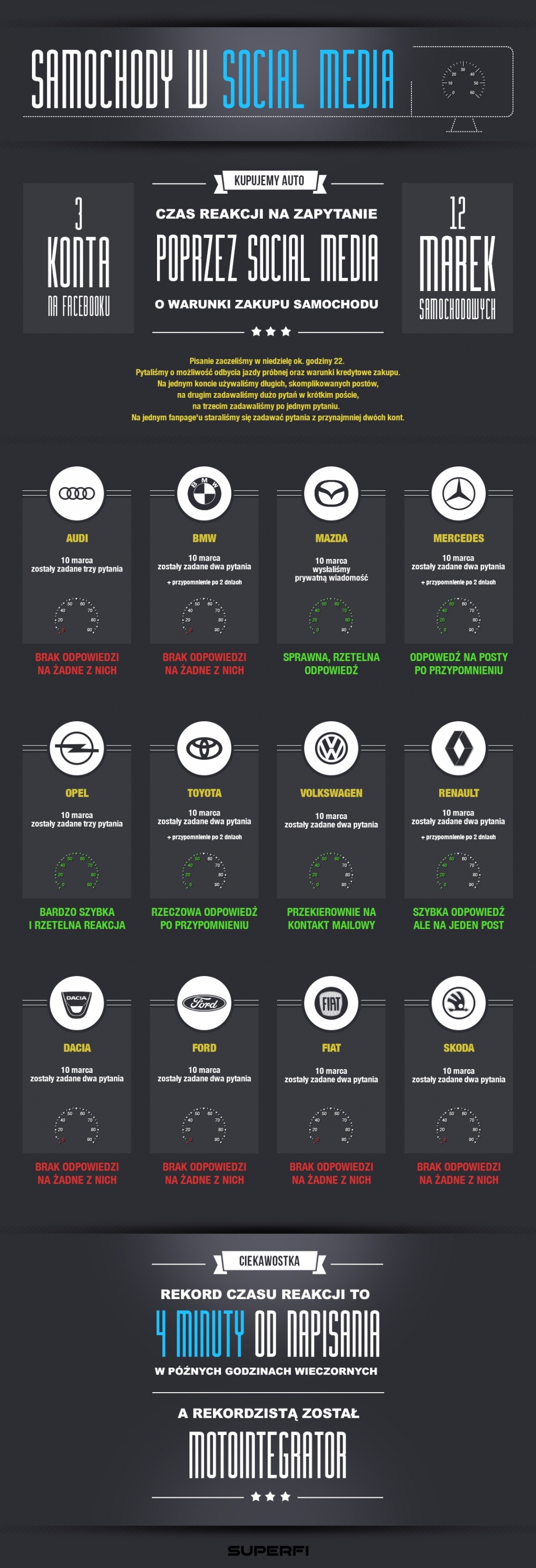 My zrobilibyśmy dokładnie to samo! Ale wcześniej zaglądnęliśmy na strony firmowe największych marek na Facebooku. Zadaliśmy pytanie i… czekaliśmy. 12 największych marek, jedno krótkie pytanie od Klienta i chwila prawdy! Jak BMW, Audi, Mazda czy Fiat poradziły sobie na swoim własnym fanpage’u? Zapraszamy do infografiki „Samochody w social media” – mówią przedstawiciele Super-Fi Interactive.
