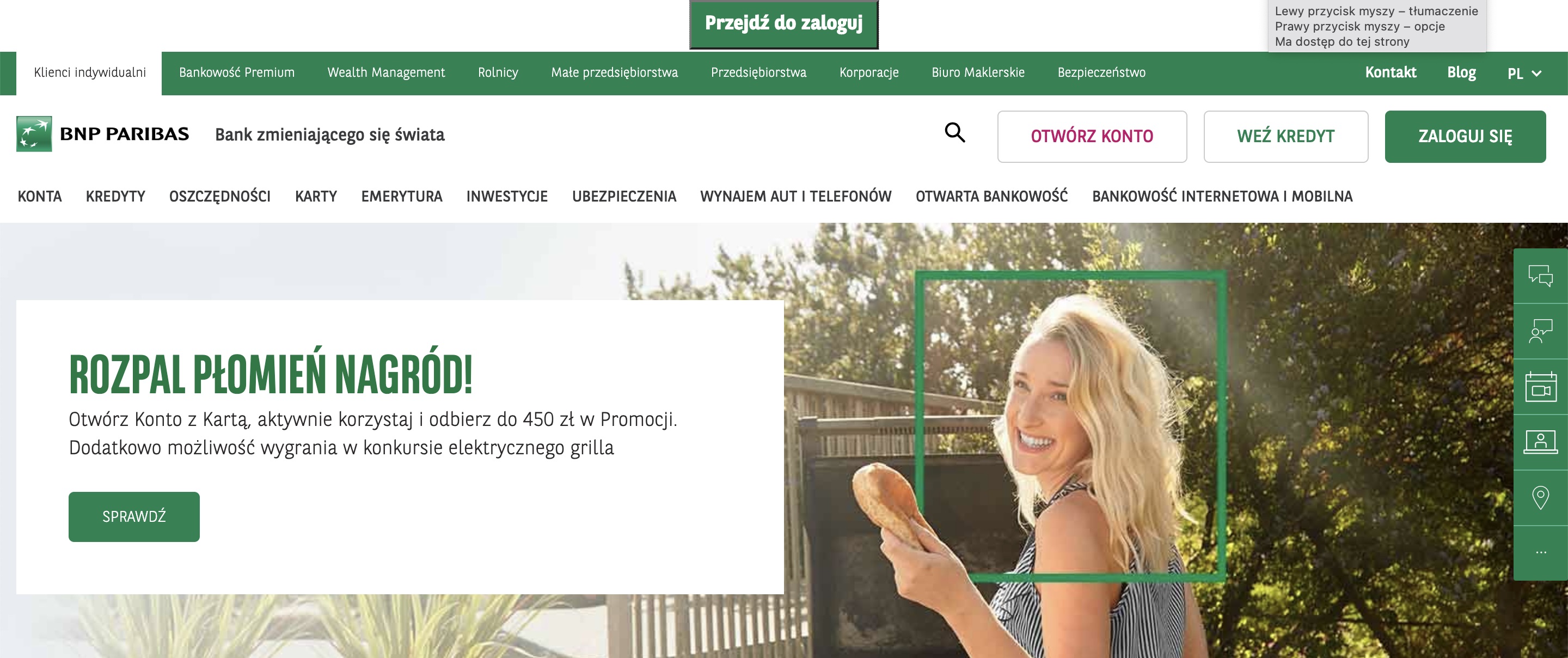 - „link pozwalający przeskoczyć szybko do treści („przejdź do treści”)” – to taka funkcjonalność, która jest sporym ułatwieniem, dla osób niewidomych i korzystających z klawiatury. Zamiast za każdym razem przeklikiwać się przez całe menu strony, można od razu przejść do jej zawartości, np. opisu produktu czy logowania, jak to jest np. na stronie banku BNP Paribas: