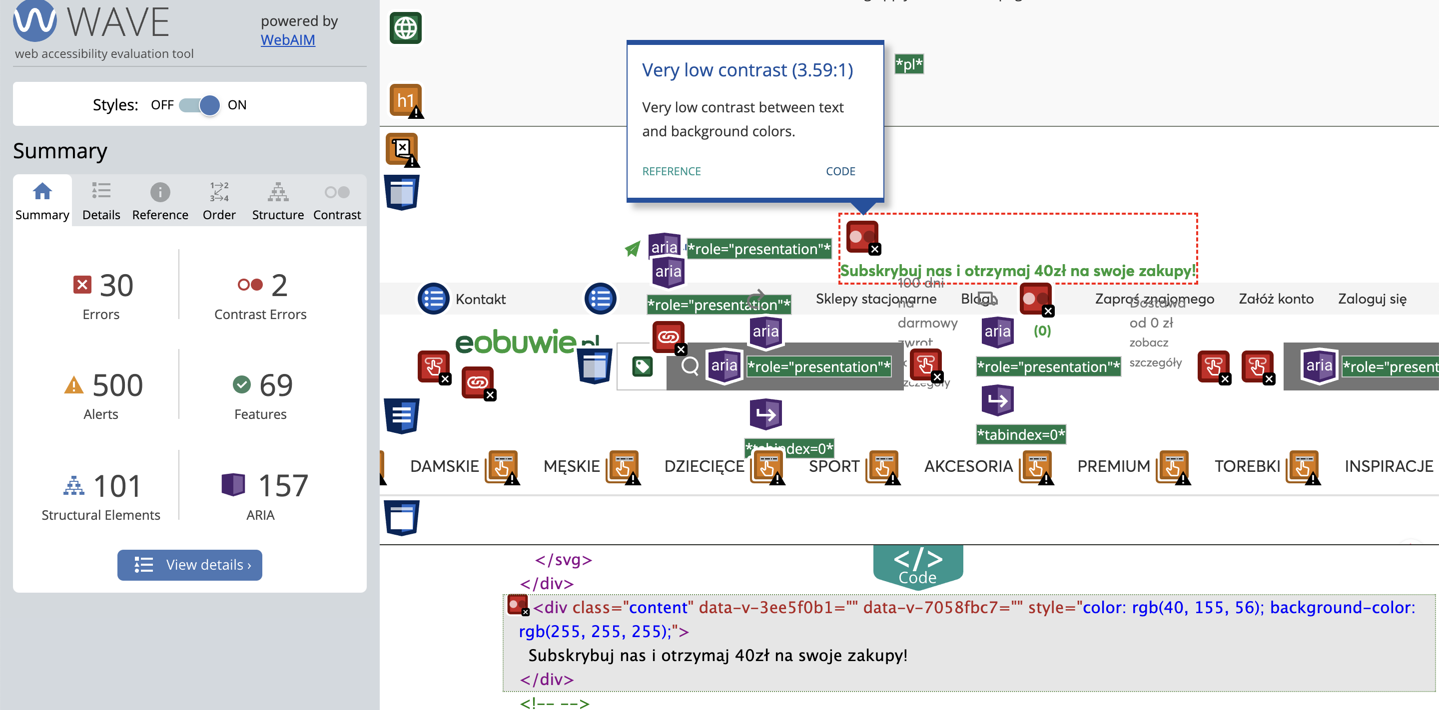 Gdy wiesz już, jakie rzeczy są istotne w obszarze dostępności cyfrowej, przetestuj stronę za pomocą darmowych narzędzi online. Jest ich naprawdę wiele, a ze swojej strony polecam WAVE. Wskazuje ono nie tylko elementy krytyczne na stronie, ale także sugeruje rzeczy do poprawienia i podpowiada, jak rozwiązać daną niezgodność z wytycznymi.