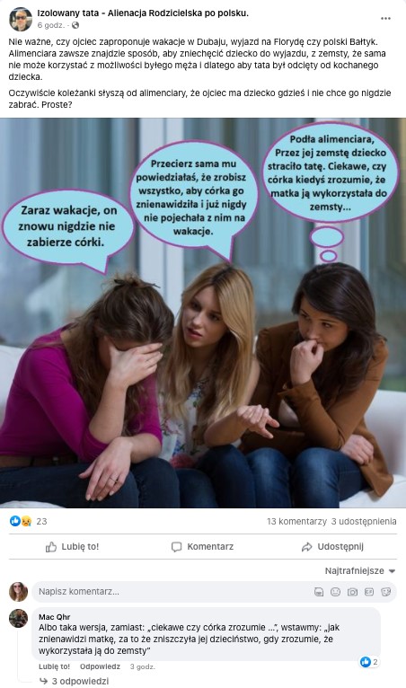 Skrajnym przypadkiem jest kwestia przyznawania praw rodzicielskich. Jak podaje GUS, w Polsce jest około 300 tys. samotnych ojców – w porównaniu z grupą samotnych matek (ok. 2,5 mln). Fora i grupy poświęcone samotnemu ojcostwu przedstawiają zupełnie inny obraz niż fora i grupy kobiece lub neutralne płciowo, gdzie następuje wymiana informacji i doświadczeń. Grupy takie jak Samotny Ojciec czy Izolowany Tata Alienacja Rodzicielska Po Polsku pełne są frustracji, bezsilności, walki i niestety… nienawiści do kobiet.