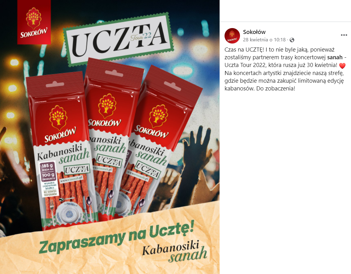 Dziś już wiemy, że ta publikacja nie była przypadkowa (czym być może zainteresuje się UOKiK). Okazuje się, że niewinne wyznanie dotyczące preferencji jedzeniowych artystki było elementem współpracy z marką Sokołów. Efektem wspólnych działań jest specjalna linia… kabanosów sygnowana pseudonimem artystki. „Kabanosiki Sanah Uczta” bezpośrednio nawiązują do trasy koncertowej artystki, która nazywa się „Uczta Tour’22”. Sokołów został jej oficjalnym sponsorem.