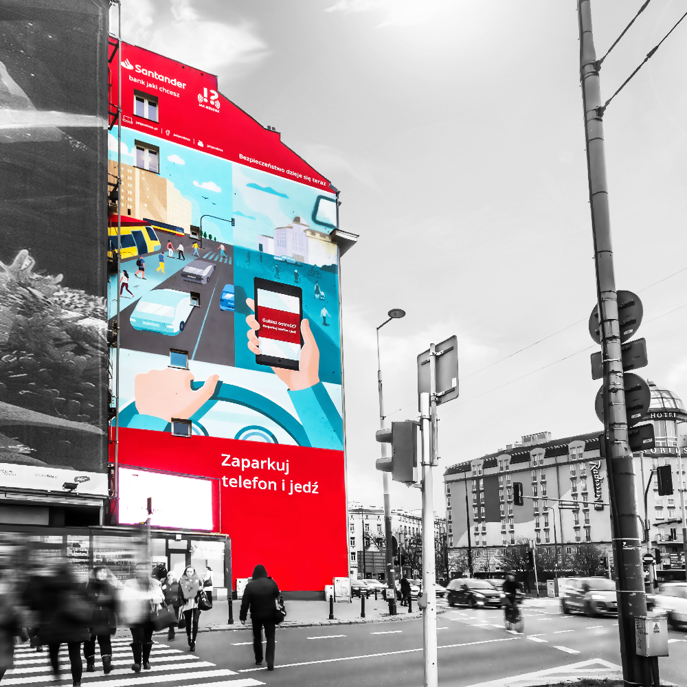 Nie jest łatwo zmienić przyzwyczajenia kierowców, dlatego Bank podjął decyzję o kontynuowaniu walki z problemem także w 2019 r. Tegoroczną kampanię zainaugurował w lutym br. imponujących rozmiarów mural przy jednym z najbardziej zakorkowanych miejsc w Warszawie – Placu Zawiszy. Mural „#Zaparkuj telefon i jedź” miał w niestandardowy sposób przypominać kierowcom, że wpatrywanie się w smartfona podczas jazdy rozprasza naszą uwagę, a to stwarza zagrożenie nie tylko dla nas samych, ale wpływa na bezpieczeństwo wszystkich innych uczestników ruchu drogowego.