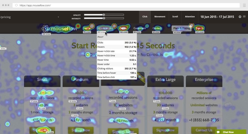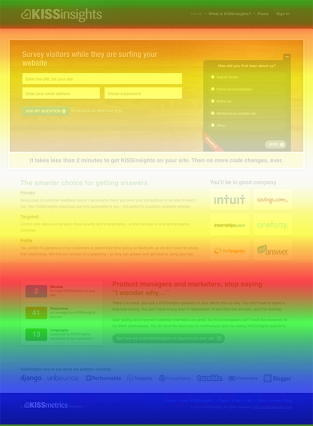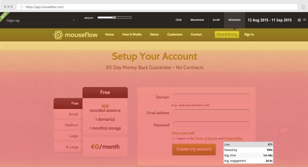 Rozkład uwagi – to funkcjonalność dostępna tylko w niektórych narzędziach takich jak Mouseflow, czy ClickTale. Rejestruje on czas przebywania na poszczególnych sekcjach podstrony i stanowi bardzo dobre uzupełnienie raportu przewijania. Badając diagramy dowiemy się na przykład, czy któreś z ważnych z punktu widzenia współczynnika konwersji pasm witryny, nie umyka przypadkiem uwadze odbiorców.