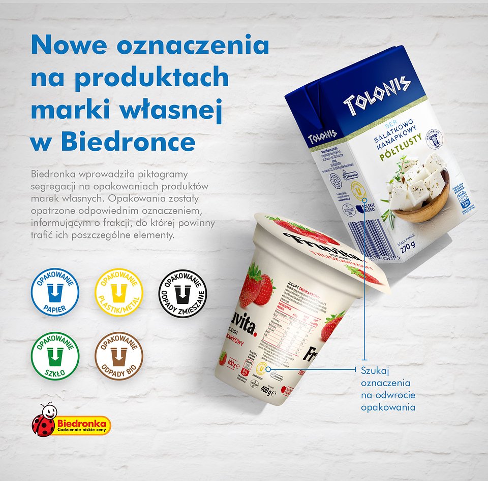 Proces umieszczania kolorowych piktogramów na opakowaniach produktów marek własnych Biedronki rozpoczął się już w maju 2020 roku – od opakowania Chipsów marki TOP. Od lipca zeszłego roku przygotowano ponad 600 projektów dla produktów marek własnych różnych kategorii, posiadających takie oznaczenia. Dzięki piktogramom, klienci sieci mogą z łatwością sprawdzić, do którego pojemnika powinno trafić opakowanie. Co więcej, gdy poszczególne jego części składają się z różnych materiałów, konsumenci znajdą na opakowaniu więcej niż jedno oznaczenie, wskazujące, w którym pojemniku je umieścić.