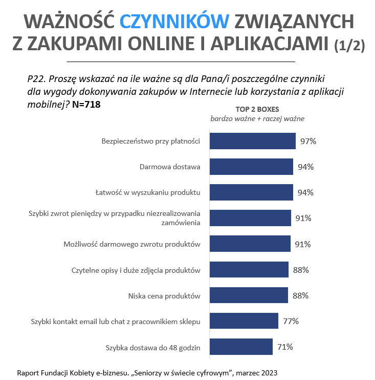 W kontekście kupowania przez internet i korzystania z aplikacji mobilnych seniorzy cenią sobie wysoko bezpieczeństwo przy płatności (97%), darmową dostawę (94%), łatwość w wyszukaniu produktu (94%), szybki zwrot pieniędzy (91%) oraz możliwość darmowego zwrotu (91%). Najbardziej preferowany przez seniorów sposób kontaktu ze sklepem internetowym to kontakt mailowy (38%).