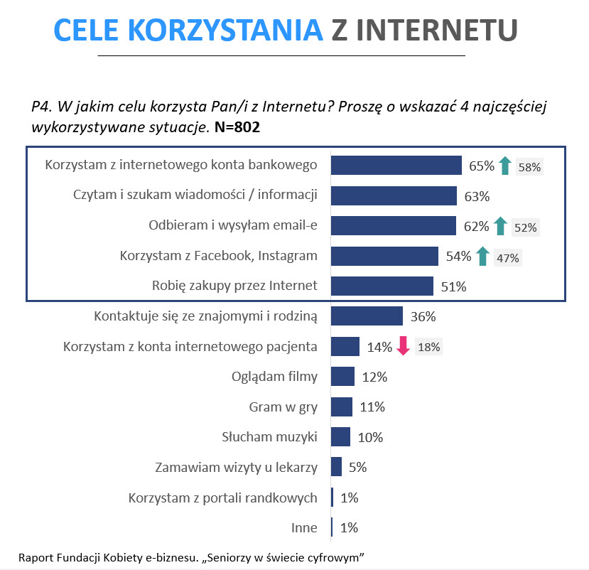 Seniorzy najczęściej wykorzystują internet, aby mieć dostęp do konta bankowego (65%), do wiadomości i informacji (63%) oraz do poczty e-mail (62%). Ponad połowa korzysta także z mediów społecznościowych (54%) oraz robi zakupy online (51%). Szczególnie w przypadku mediów społecznościowych, poczty e-mail oraz konta bankowego online można zaobserwować trend rosnący na przestrzeni ostatniego roku.
