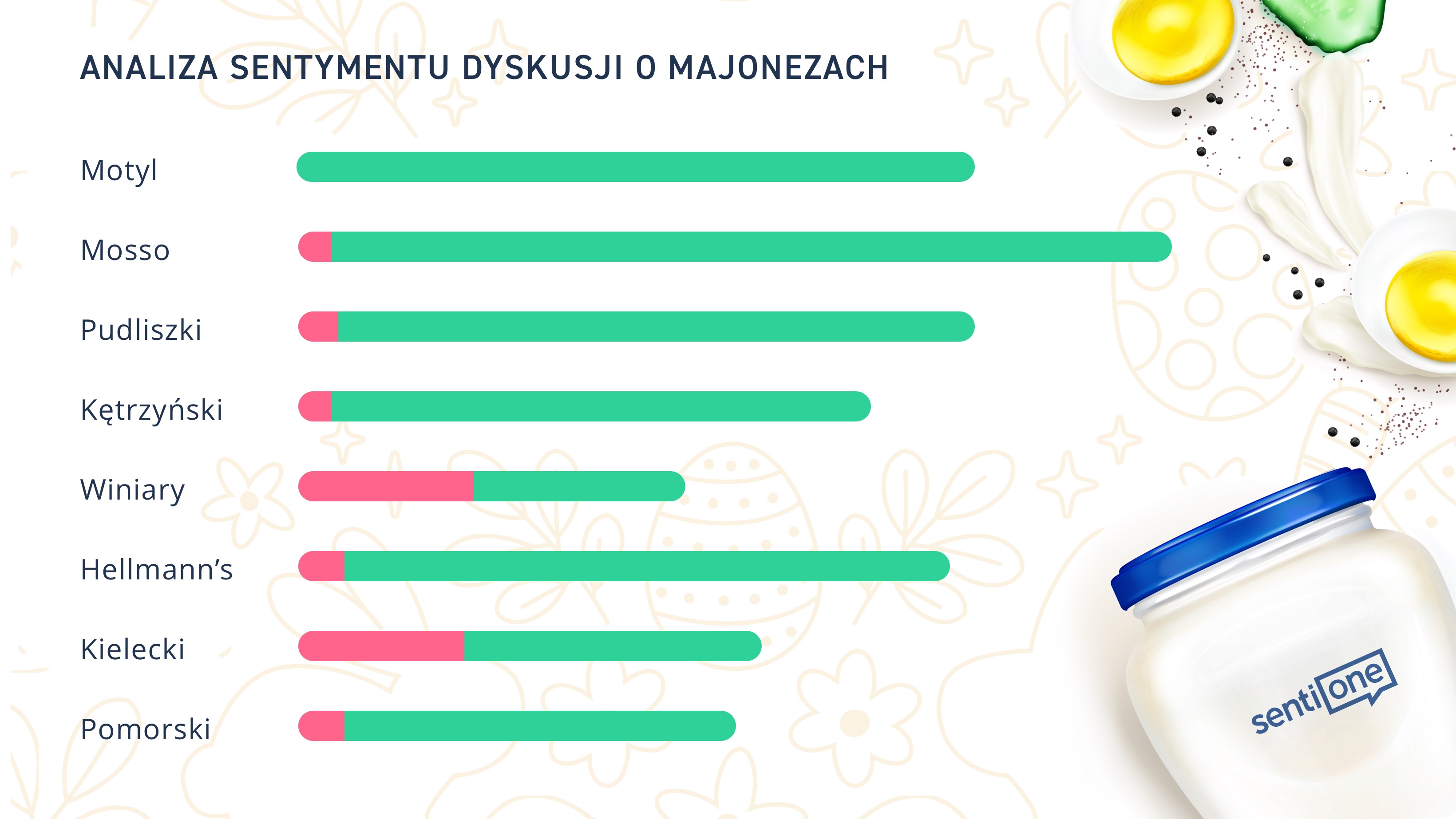 Wypowiedzi o Majonezie Kieleckim pojawiają się obecnie głównie w kontekście bojkotu Winiary. Konsumenci twierdzą, że niezależnie od postępowania Nestlé, i tak ma on lepszy skład i deklarują, że na nadchodzące święta wybiorą Kielecki. Jednak najwięcej pozytywnych emocji budzi majonez firmy Motyl – aż 37 proc. wypowiedzi na jego temat ma pozytywny wydźwięk, nie ma żadnych negatywnych. Internauci polecają go sobie na Wykopie i w komentarzach na portalach. Chwalą go za dobry skład, smak i polskie pochodzenie. Spory odsetek pozytywnych wypowiedzi odnotowują również majonezy firm Mosso, Hellmann’s, Pudliszki i Kętrzyński.