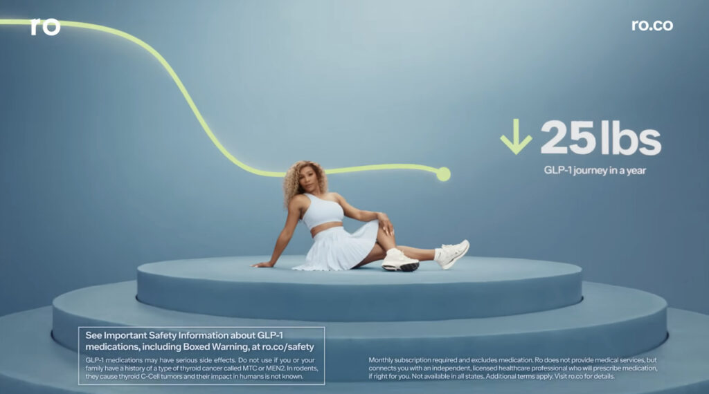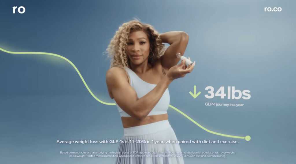 Reklama przedstawia Serenę Williams, która wstrzykuje sobie lek GLP-1 oraz zamawia jego nową wersję (w tabletce) za pośrednictwem aplikacji mobilnej. Tenisistka mówi o tym, jak preparat pomógł jej załagodzić obciążenie stawu kolanowego czy obniżyć cholesterol. Ale przede wszystkim Williams podkreśla, że dzięki niemu mogła pozbyć się 14. kilogramów.