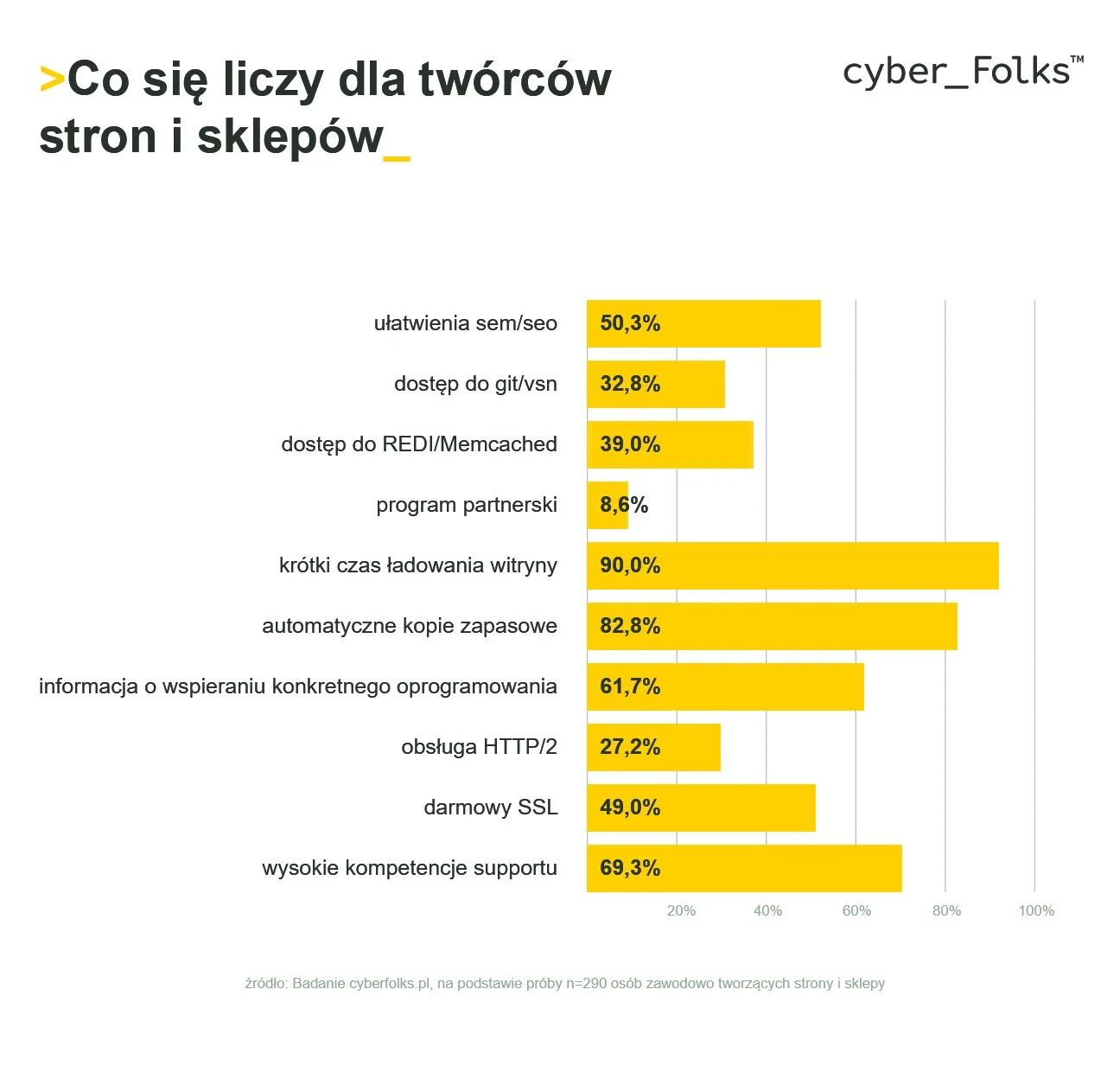 Z przeprowadzonego przez nas badania wynika jasno, że osoby zajmujące się profesjonalnie stronami i sklepami doceniają przede wszystkim szybkość działania i bezpieczeństwo: