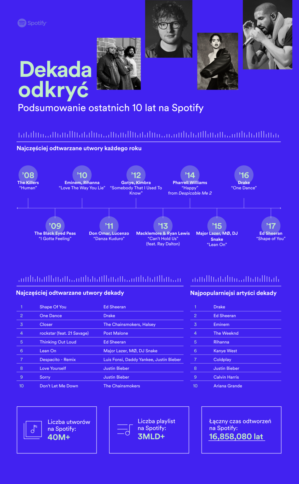 Aby uczcić tę ważną rocznicę, Spotify stworzyło listy najczęściej odtwarzanych artystów i piosenek oraz najważniejszych wydarzeń i osiągnięć ostatnich 10-ciu lat.