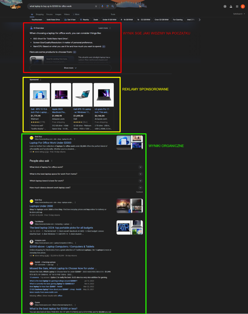 Należy jednak pamiętać, że nie każde zapytanie będzie skutkować wyświetleniem sekcji SGE. W większości przypadków będą to zapytania zawierające takie zaimki jak: „jak”, „gdzie”, „kiedy”, „najlepsze” lub „koszt”.
