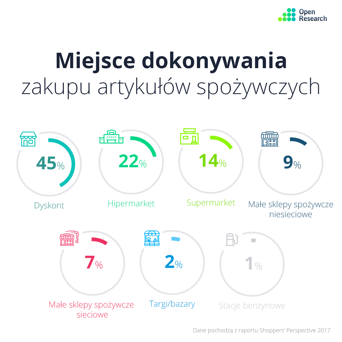 W opracowaniu przedstawione są również dane dotyczące miejsca dokonywania zakupów. Produkty z kategorii artykułów spożywczych najczęściej kupowane są w dyskontach (45%), hipermarketach (22%) i supermarketach (14%). W porównaniu z wynikami z zeszłorocznego raportu, w kategorii tej najwięcej klientów straciły dyskonty (z 51% do 45%). Także artykuły chemiczne najczęściej nabywane są w dyskontach (32%), hipermarketach (25%) i supermarketach (18%), a z kolei kosmetyki najchętniej kupujemy w drogeriach sieciowych (51%).