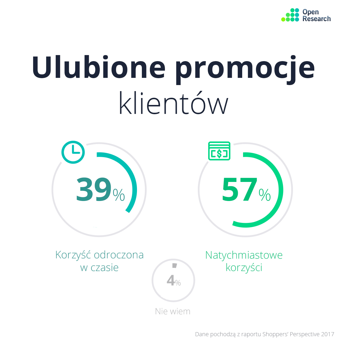 57% kupujących preferuje promocje z natychmiastową możliwością czerpania korzyści, takie jak np. tymczasowe obniżki cen czy bony na ponowne zakupy. W porównaniu do ubiegłego roku, liczba ta spadła o 8 pkt. procentowych.