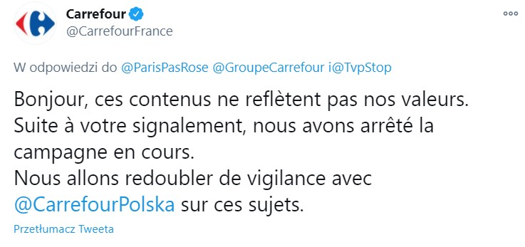 Na odpowiedź przedstawicieli marki nie trzeba było długo czekać – francuska centrala Carrefour opublikowała na swoim twitterowym profilu wpis, w którym napisała, że homofobiczne treści, na które zwróciła uwagę internautka, nie odzwierciedlają wartości firmy. Sieć poinformowała również o wstrzymaniu reklamy na platformie TVP VOD i podkreśliła, że „podwoi czujność @CarrefourPolska na tego typu tematy”.