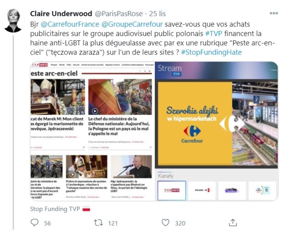 „Czy jesteście świadomi tego, że kupując reklamy w polskiej grupie nadawców publicznych #TVP, jednocześnie finansujecie najbardziej obrzydliwą nienawiść względem osób LGBT?” – napisała internautka, zwracając się do francuskiego oddziału sieci Carrefour.