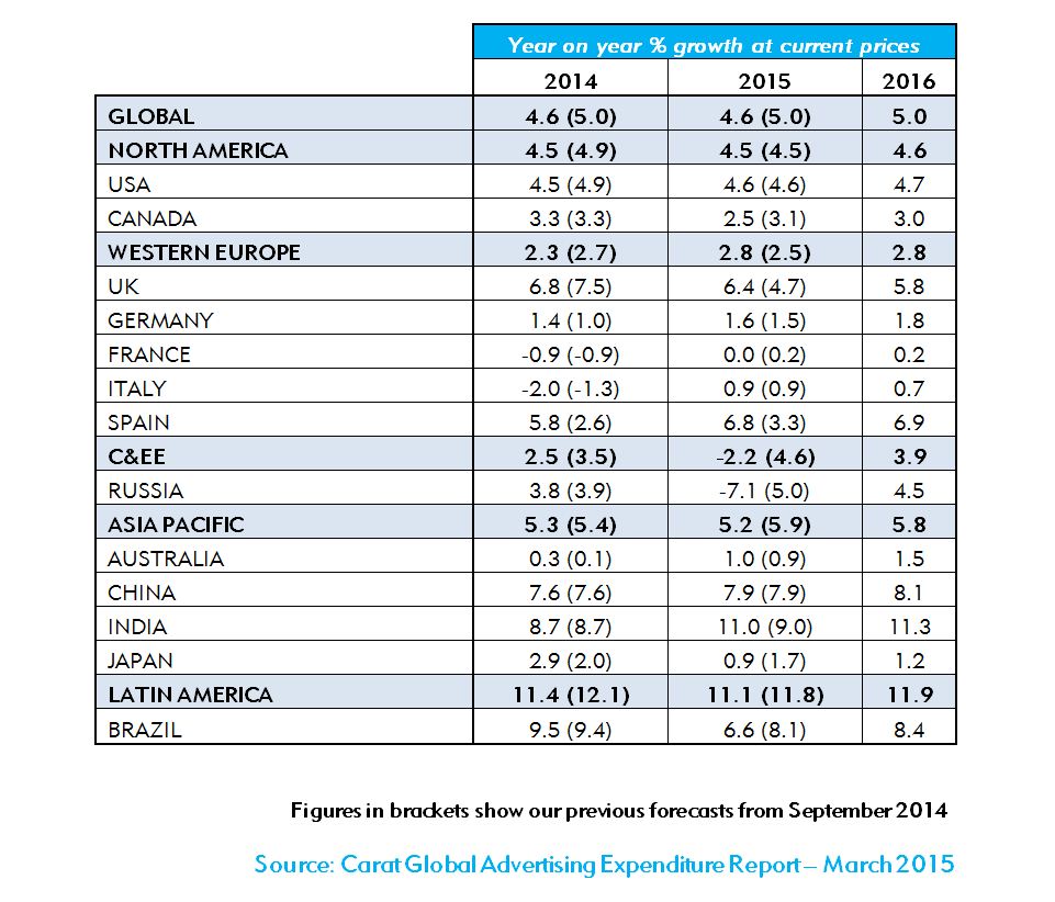 Według prognoz Carat wydatki na reklamę we wszystkich mediach w 2015 roku wzrosną o 23,8 mld USD i osiągną poziom 540 mld USD, co oznacza wzrost o 4,6% względem poprzedniego roku. Optymizm na rynkach utrzyma się również w 2016 roku. Prognozy Carat przewidują wzrost rynku reklamy na świecie na poziomie 5,0% w stosunku do poprzedniego roku.