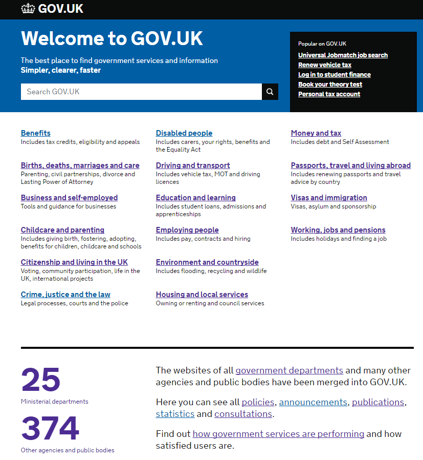 Na początku 2012 przeprowadzono w Wielkiej Brytanii unifikację wszystkich stron rządowych pod wspólnym adresem Gov.uk, wykorzystując przy tworzeniu tego portalu jasno określone zasady projektowania UX, stosowane do tamtej pory głównie przez sektory prywatne. Dzięki temu połączeniu możliwe stało się zaoferowanie obywatelom dostępu do wszelkiego rodzaju rządowych treści i narzędzi z poziomu jednej platformy.